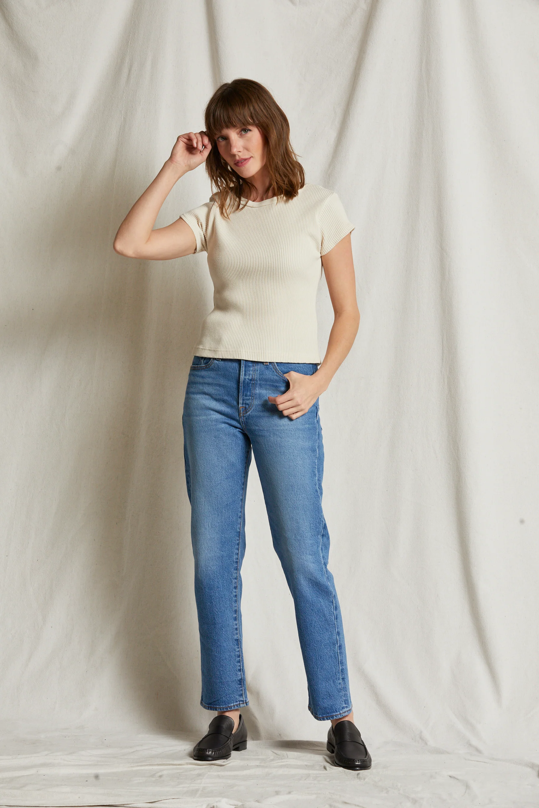 the harper is a relaxed mid-rise jean with a flattering square top block and a straight yet subtle cropped wide leg. style back to our best selling white tee shirts.